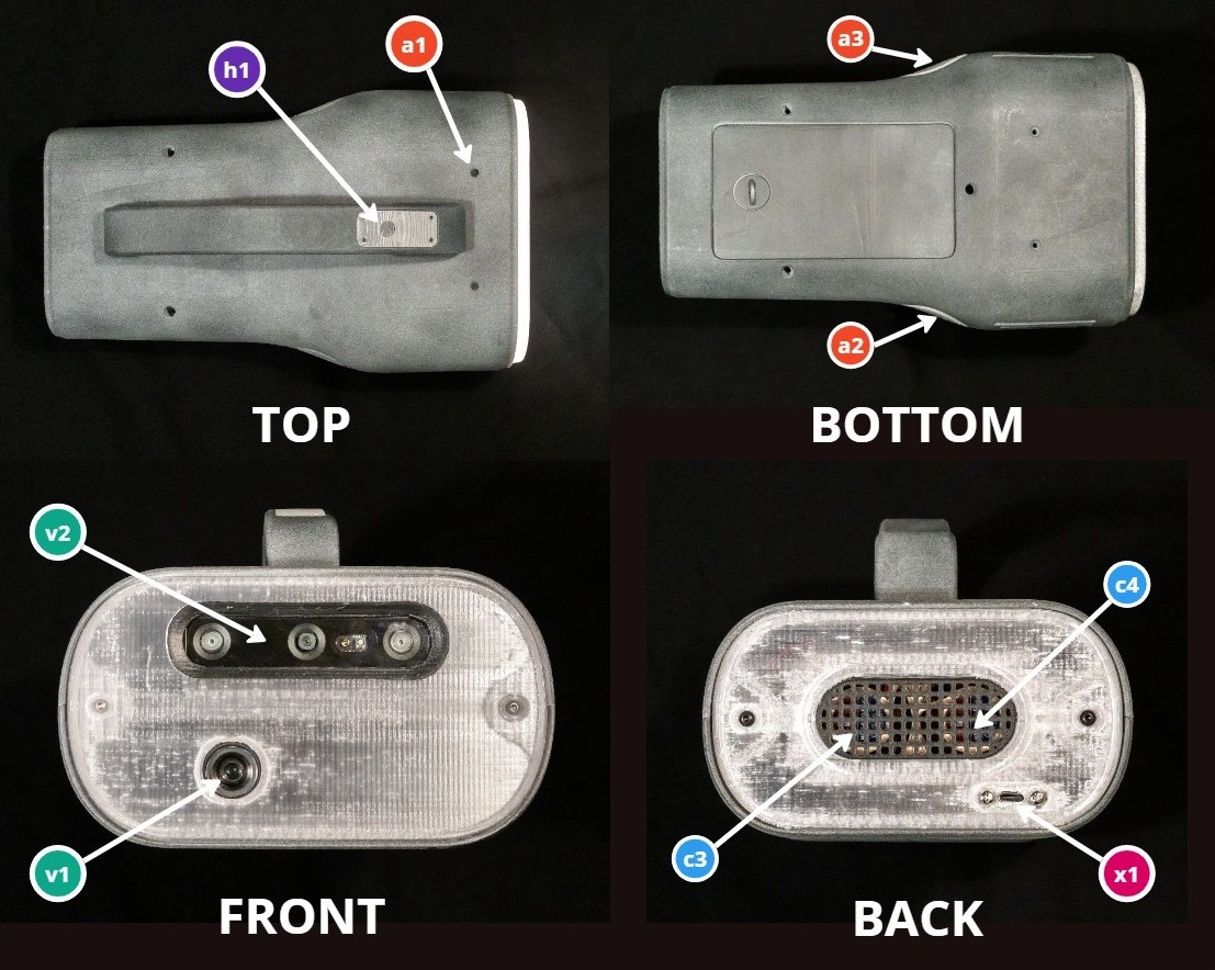 Figure 5: photos of the ARML from the top, bottom, front and back. The labels correspond to labels in the system diagram and the component list.